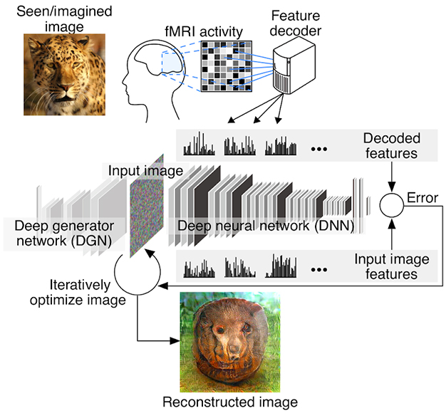Авторы попытались буквально реконструировать изображения, на которые смотрят люди в фМРТ-сканерах. Для этого они обучили глубокую нейронную сеть на результатах фМРТ, а затем попытались совместить признаки нового изображения с признаками фМРТ человека. Иными словами, они делали как раз то, что мы обсуждали выше: подгоняли картинку под заданные признаки, сгенерированные нейронной сетью. Разница только в том, что признаки теперь заданы не нужным выходом или признаком, а результатом работы другой сети (тоже, конечно, сверточной) на данных фМРТ. На этом видео можно увидеть, как сеть постепенно подгоняет картинку под заданный паттерн фМРТ: