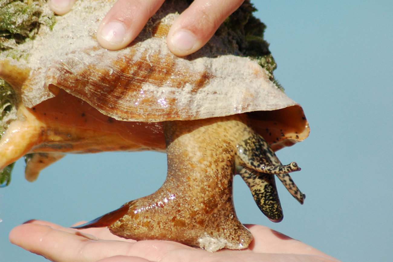 У некоторых видов нога служит скорее присоской. Эти моллюски, Пателлы, Фиссуреллы и масса других, чтобы спокойно обитать в прибойной зоне, присасываются к камням с такой силой, что никакой шторм не может их оторвать. Когда брюхоногий моллюск ползет по твердой поверхности, например, по стеклу аквариума, хорошо видны пробегающие по ноге волнообразные сокращения мышц, передвигающие моллюска. А многие брюхоногие, имеющие на спинной стороне ноги крышечку, еще и закрывают ею вход в раковину, когда при опасности испуганный хозяин втягивает в нее свое тело. У трохусов крышечка напоминает мощный щит. У чилийского моллюска Конхолепас перувианус устье раковины так велико по сравнению с крышечкой, что становится ясно, почему чилийцы назвали его «loco» — сумасшедший. У стромбусов крышечка похожа на коготь, с ее помощью моллюск может прыгать. Да–да! Как это ни странно по отношению к моллюску! Мой друг, известный малаколог Б.И. Сиренко, рассказывал, как в Новой Гвинее под водой наблюдал за группой травоядных моллюсков, — небольшое стадо Стромбусов лентигинозус, покинув свое убежище и прыгая, как лягушки, направлялось на пастбище в заросли морской травы.
