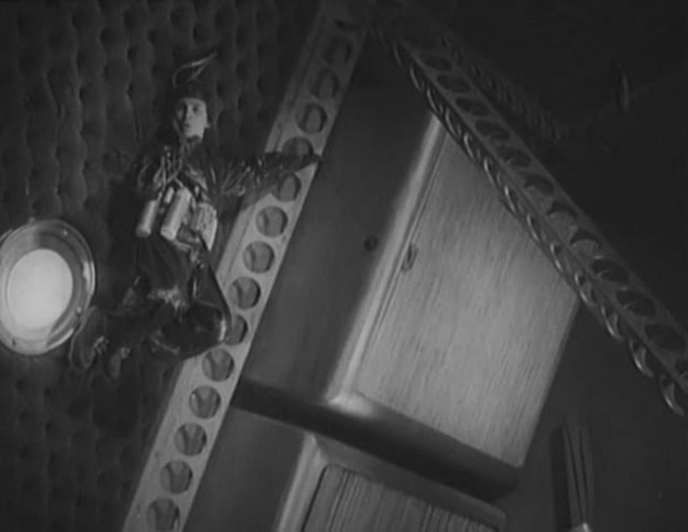 В других сценах вращали фон — огромный кусок декорации, прикреплённый к сложной конструкции. «Космонавт» висел неподвижно — поворачивалась камера, синхронизированная с декорацией благодаря системе блоков и шестерней. На экране это выглядело так, будто человек вращается в кабине звездолёта.